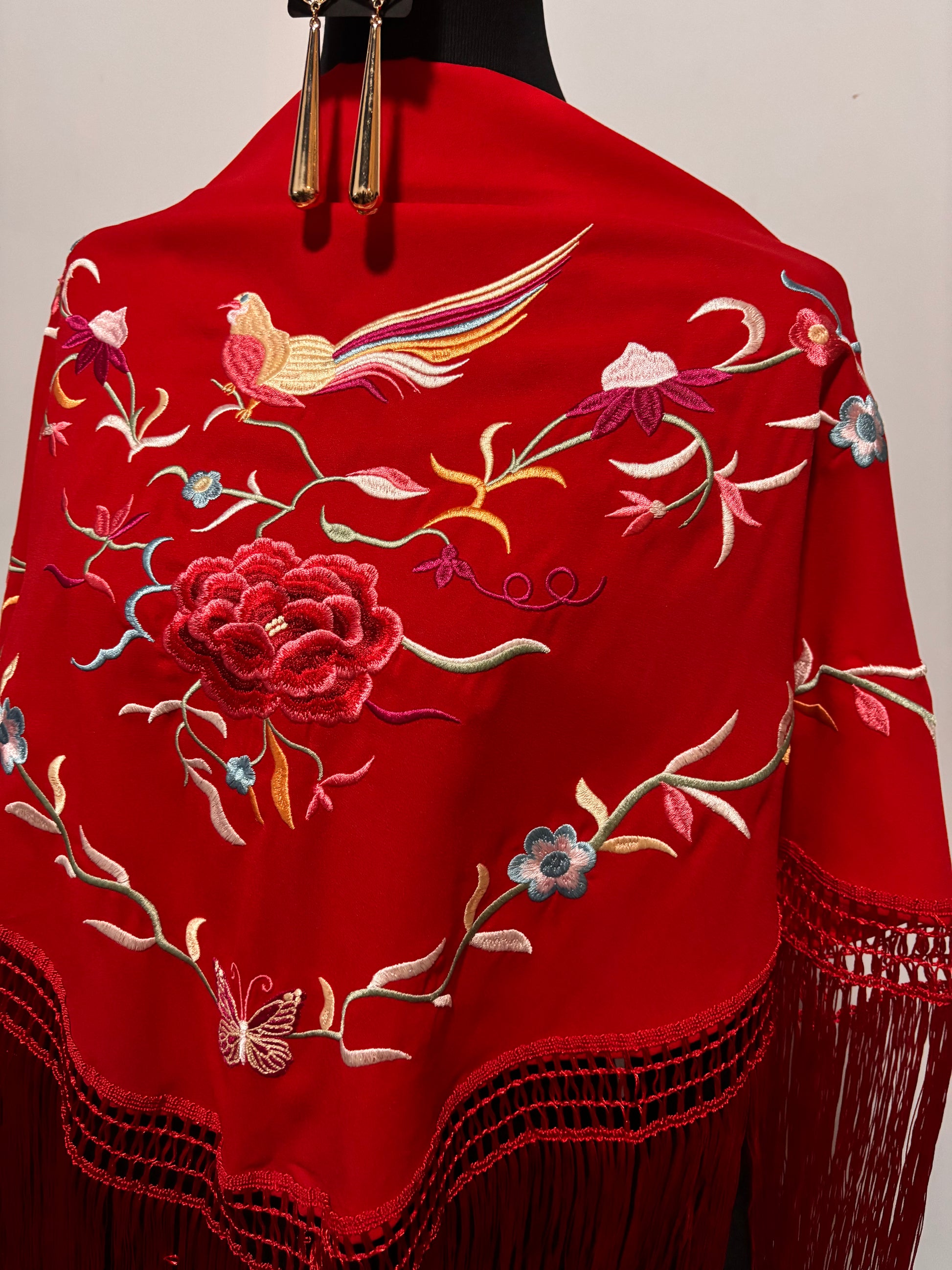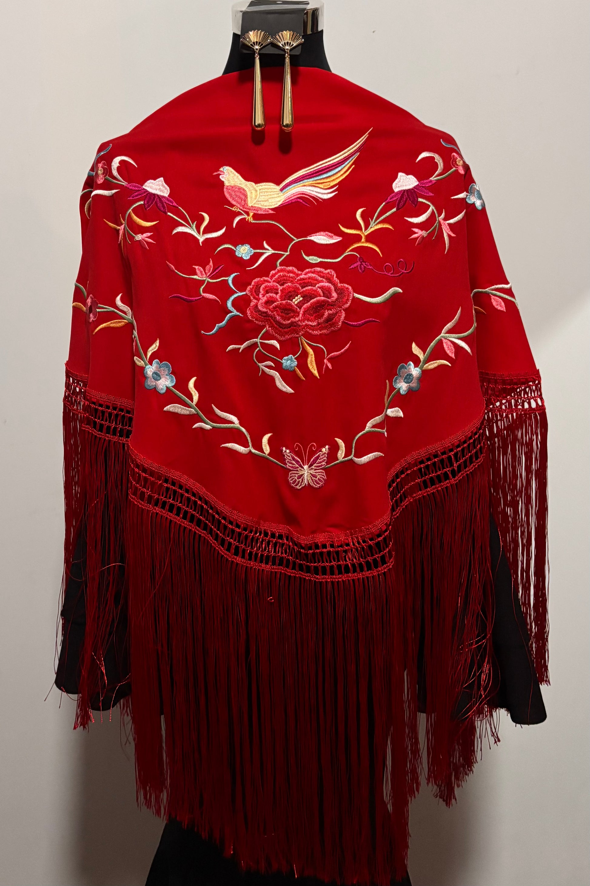 La tela es crespón y los flecos son flecados a mano en seda. Medidas: 140x50+35(flecos).