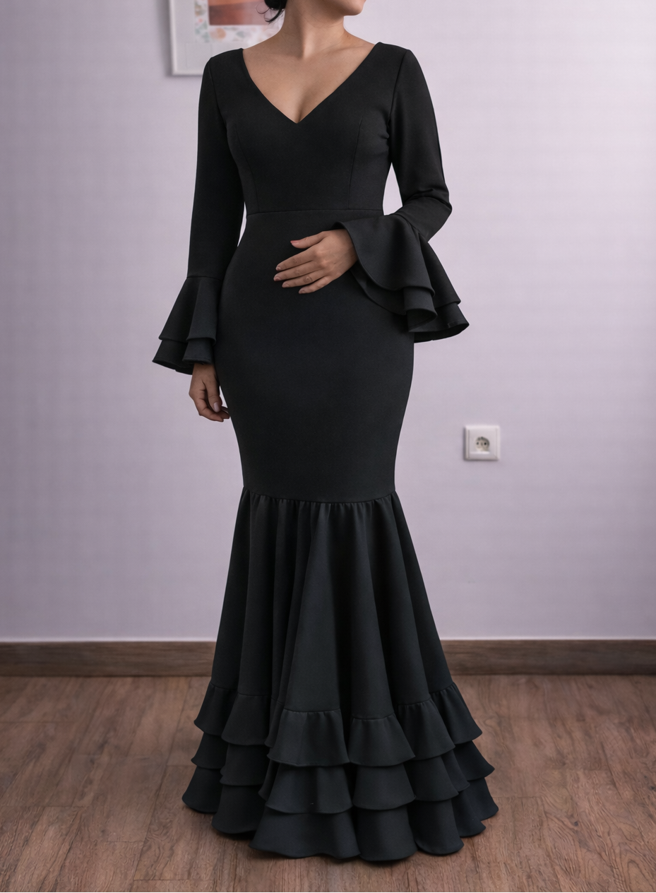 Descubre este espectacular vestido de flamenca confeccionado con tejido elástico de alta calidad, que se adapta perfectamente a tu figura, ofreciendo comodidad y estilo en cada movimiento. Este diseño, ideal para cualquier ocasión flamenca, combina tradición y modernidad para realzar tu belleza.